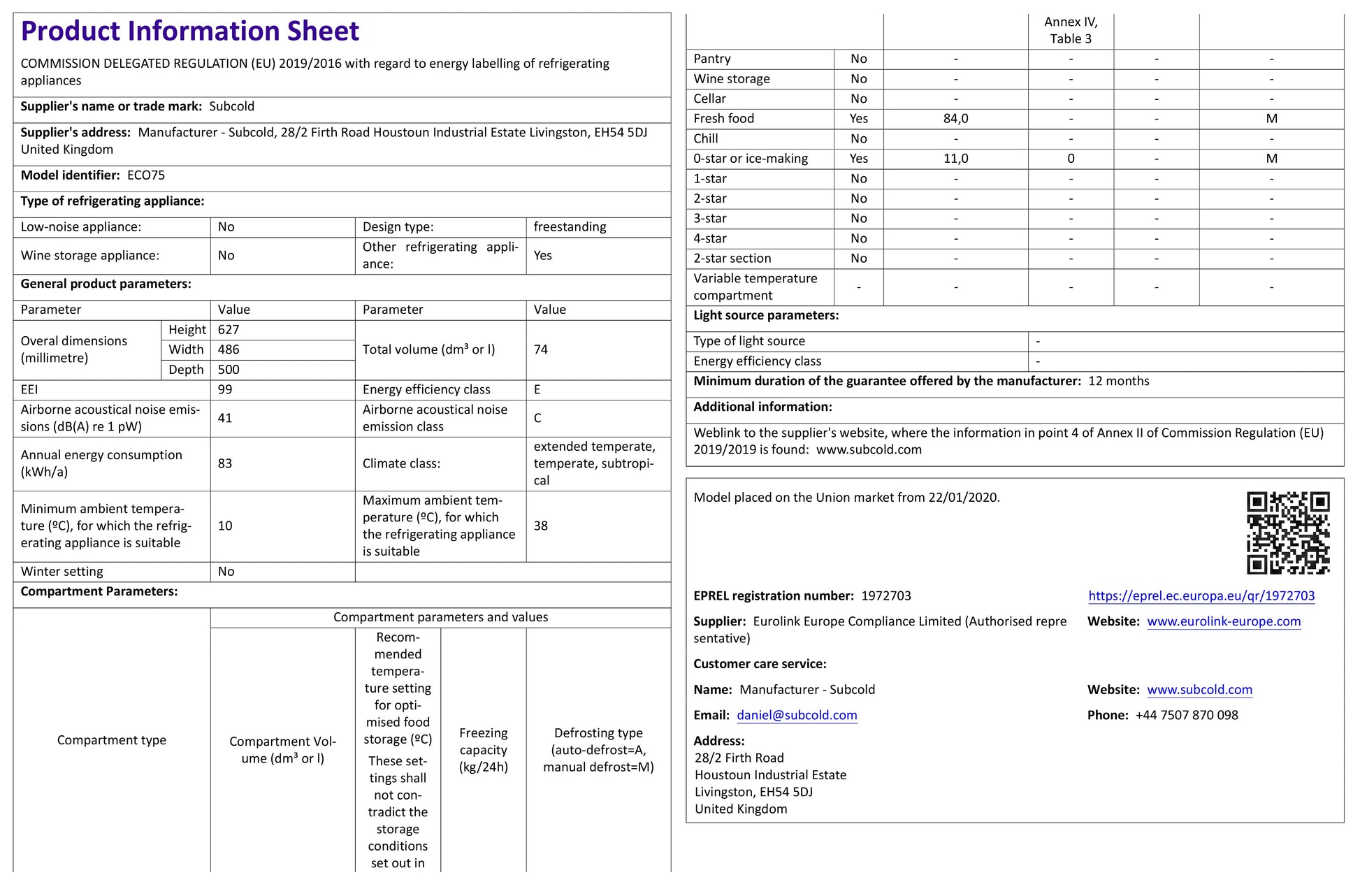 The Subcold Eco75 is equipped with advanced compressor technology cooling for optimum performance. It is a very economical fridge with an impressive energy consumption of only 83kWh/annum!