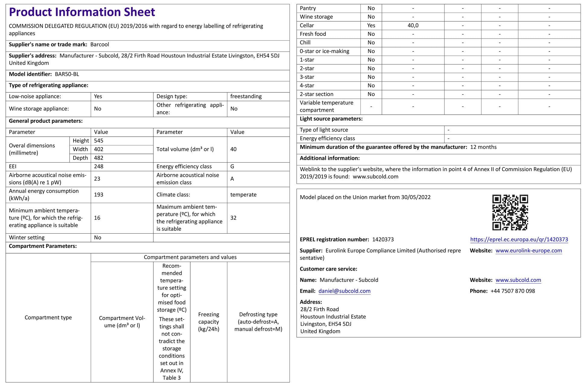 The design of the Barcool Bar50 LED is highly versatile and fits well into most quiet areas such as a bedroom, hotel room, guesthouse or a B&B. It is energy efficient fridge offering reliable cooling. Thanks to its high presentation factor and low noise operation [23dB] - this advanced mini bar fridge is suitable for use in any room!