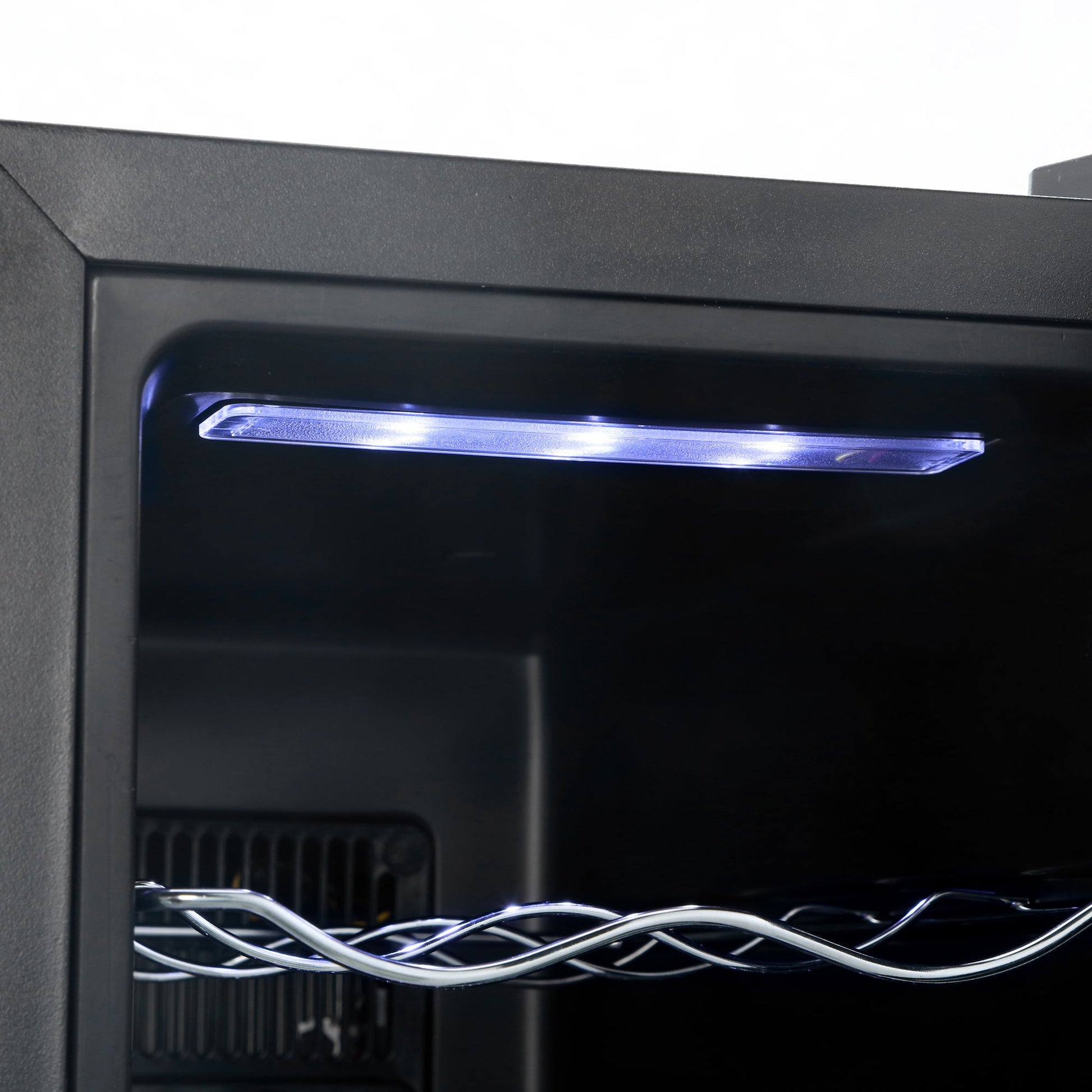 This wine cooler also features a dual glazed UV-tempered mirrored glass door, which protects your wine from harmful UV rays and enhances the unit’s sleek, modern appearance. Inside, LED lighting gently illuminates your collection, while removable shelves offer flexible storage options to suit different bottle sizes and arrangements. The adjustable feet ensure stable placement on any surface, whether it's table top, under a desk or free-standing.