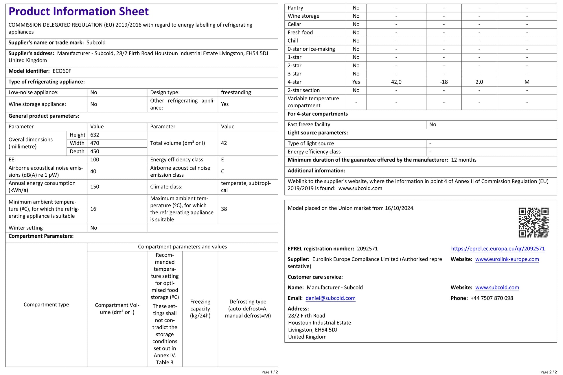 Its sleek, space-saving design ensures functionality without compromising style, making it perfect for households needing extra freezing capacity or a standalone unit for smaller spaces. Choose the Subcold ECO60F for dependable performance, energy efficiency, and compact convenience.