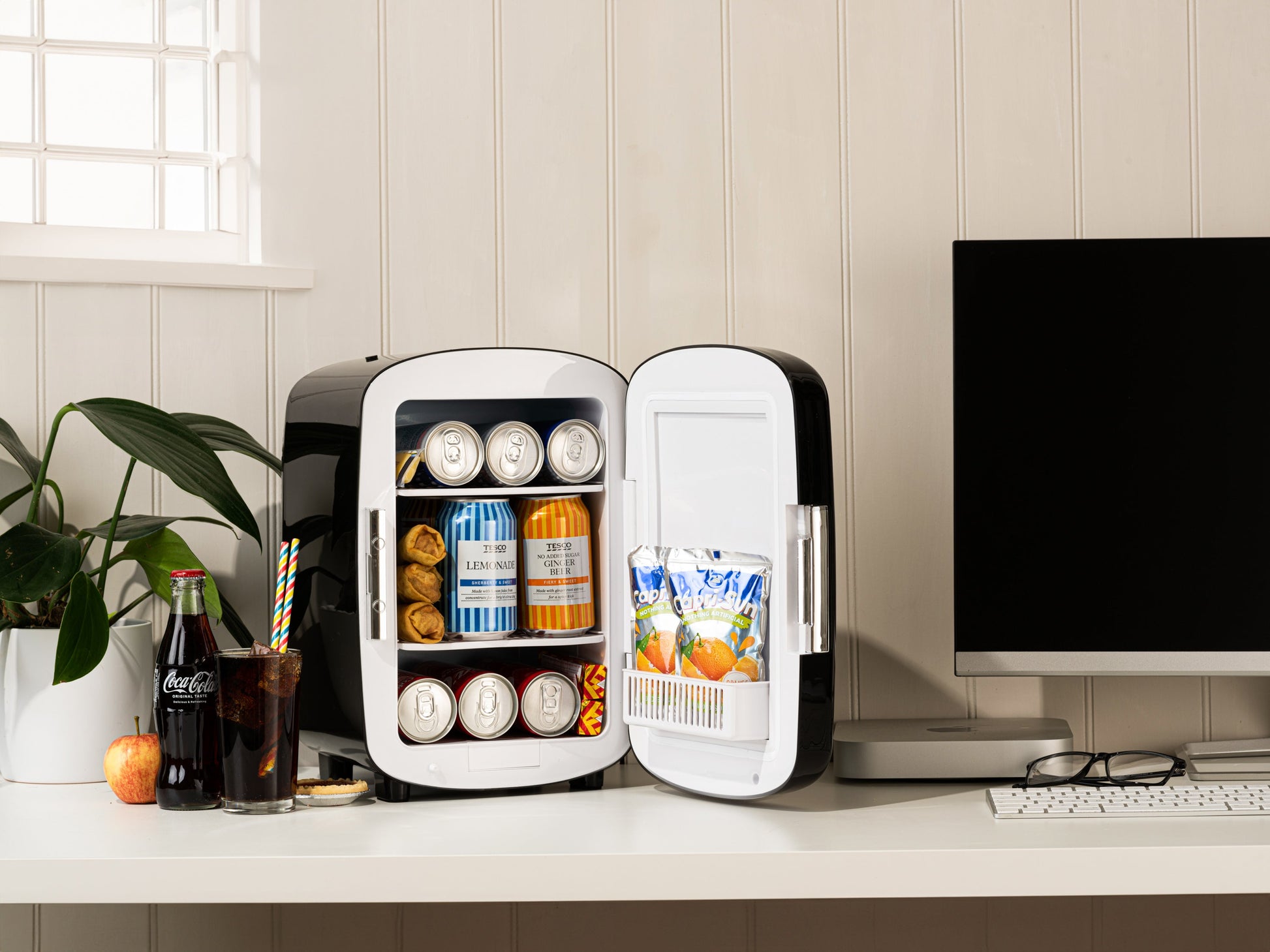 A perfect personal mini fridge to keep your snacks and drinks perfectly chilled just the way you need it. It has a storage capacity of 6 litres meaning you can store up to 8 (330ml) cans.